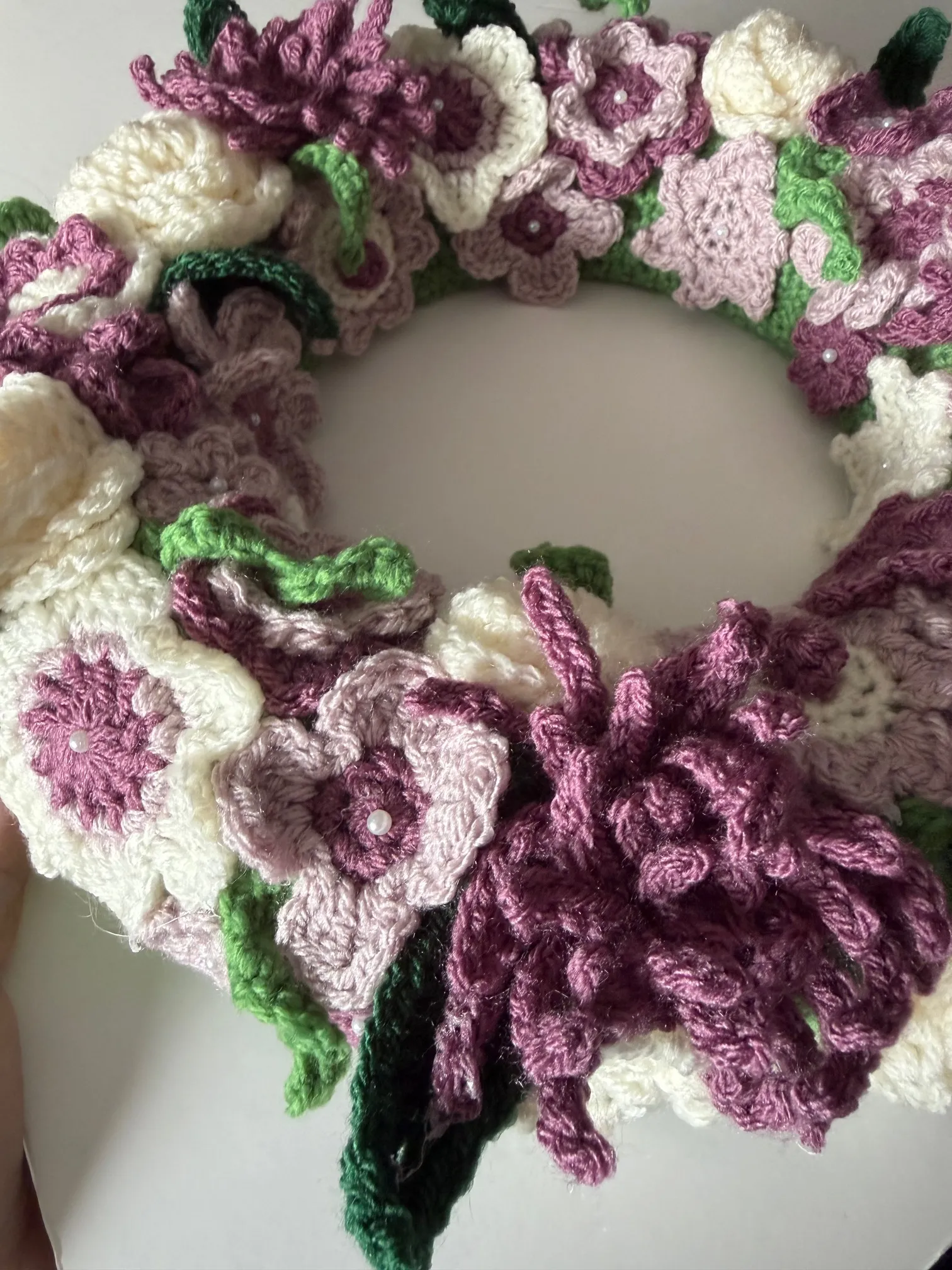 An online course to make a Crochet Floral Wreath. In the 7 weeks we will learn how to cover the wreath ring in yarn as well as making 9 different flowers, 2 types of leaves and guidance on how to position them on your wreath.