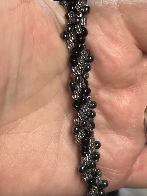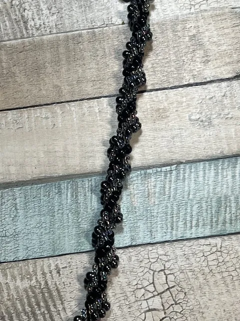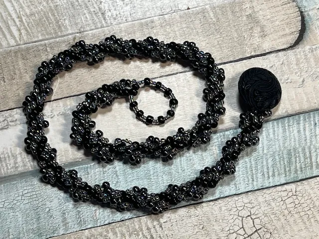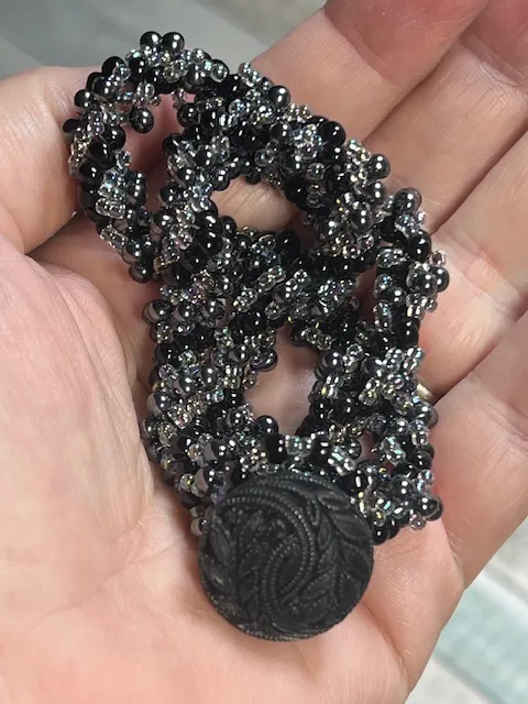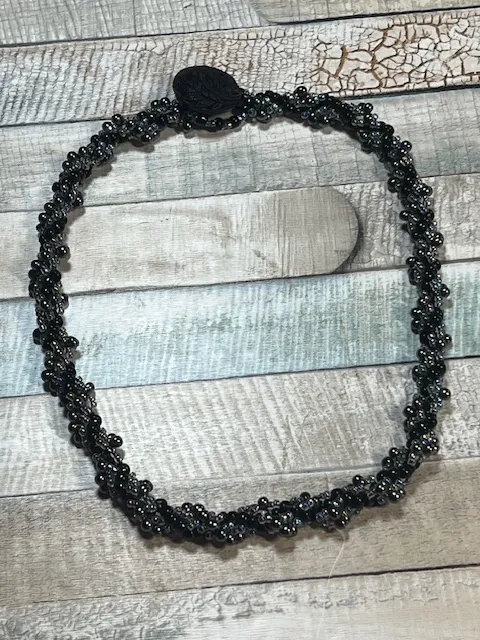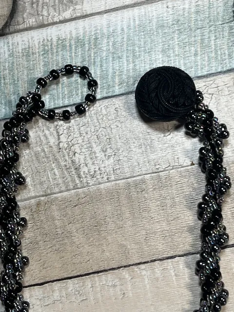 A lovely handmade necklace consisting of tiny irridescent black beads alongside AB lined glass beads hand sewn to create a twisted rope effect. The clasp is a beaded loop alongside an ornate vintage button.
