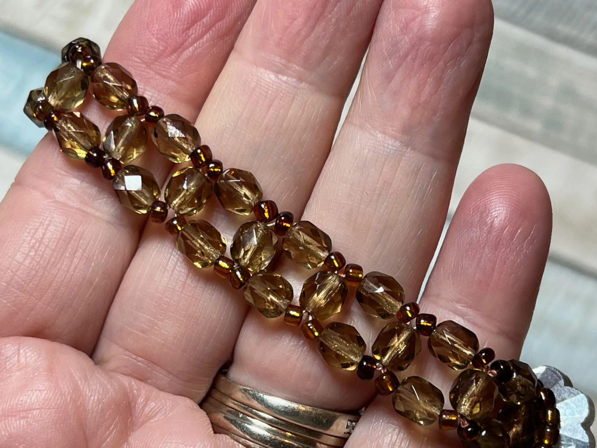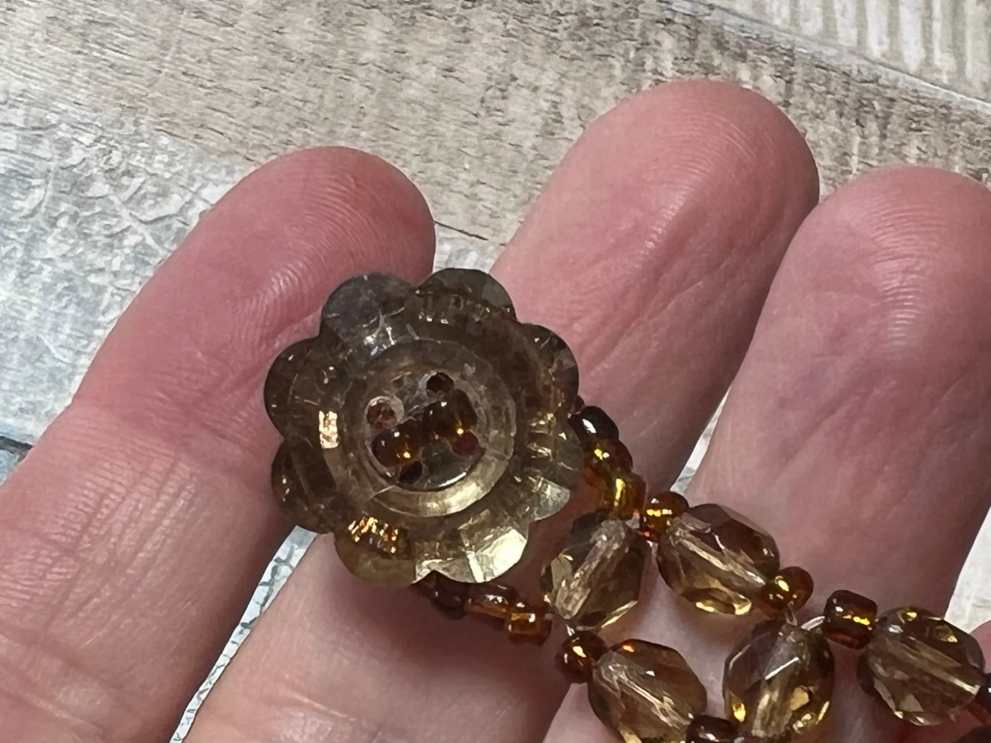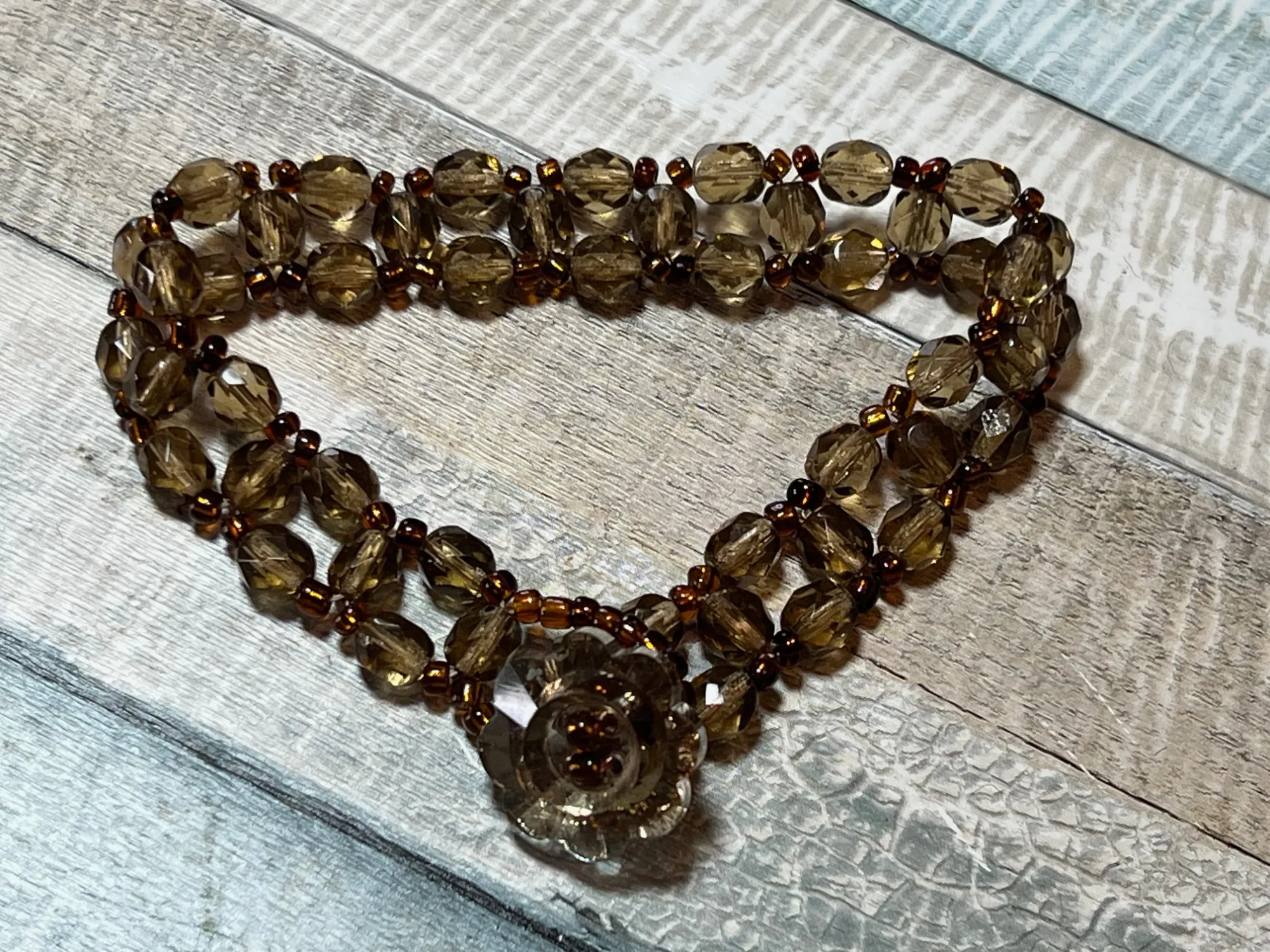 A pretty handmade bracelet created with lovely Czech Crystal beads and matching glass seed beads. The clasp is made from a crystal flower button and beaded loop, sp no metal parts.