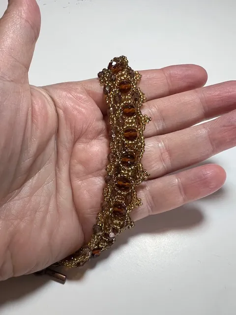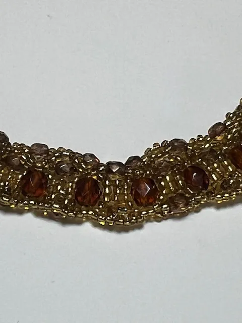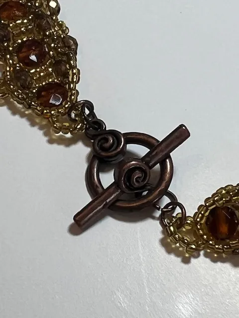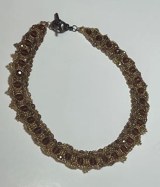 A lovely handmade necklace handwoven with Czech Crystals in shades of brown alongside golden glass seed beads. The clasp is a copper coloured toggle clasp. .