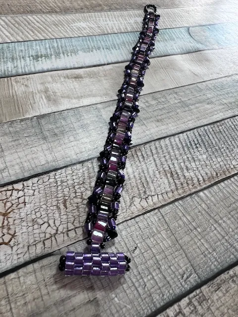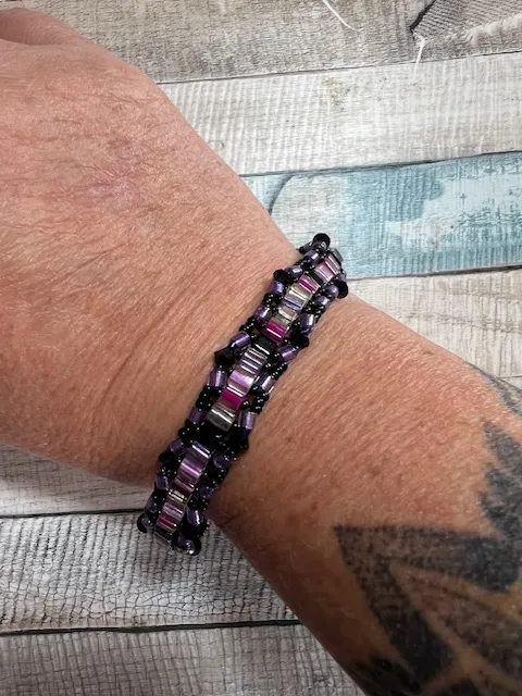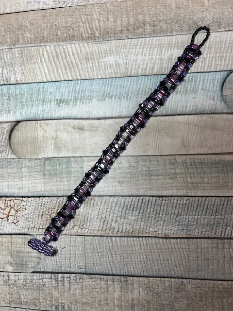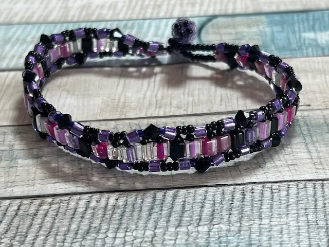 A cute little bracelet, consisting of various shades of pink, purple and black glass cube beads. The clasp is a beaded toggle and loop.