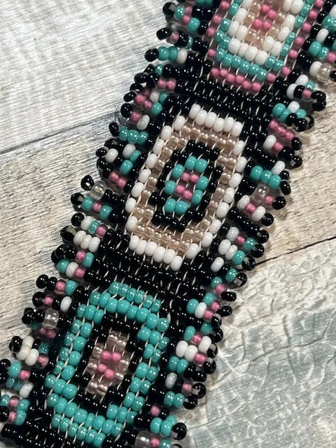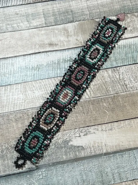 An unusual handmade bracelet, woven with an interesting pattern and a double side fringe, it fastens with a loop and a pretty heart glass button.