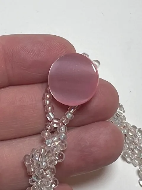 A lovely handmade necklace consisting of twist of the palesrt pink glass beads with a removable charm feature - the charms are glass and crystal with a tiny aluminum blue rose. The clasp is a button and loop.