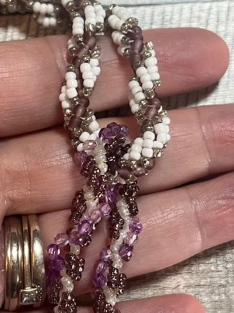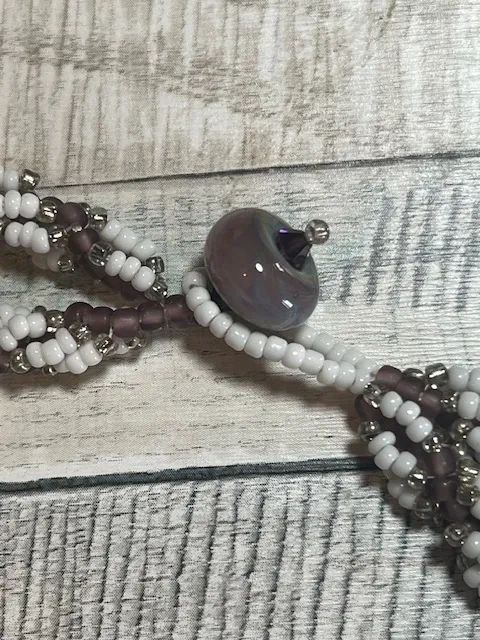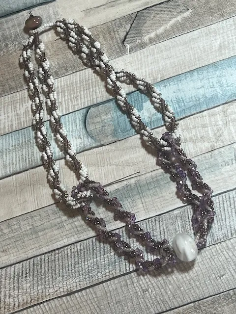An unusual handmade necklace consisting of two beaded ropes linked together with a hand made lampwork bead as the focal point. The clasp is a glass bead and loop - no metal parts. White, purple and aubergine colours.