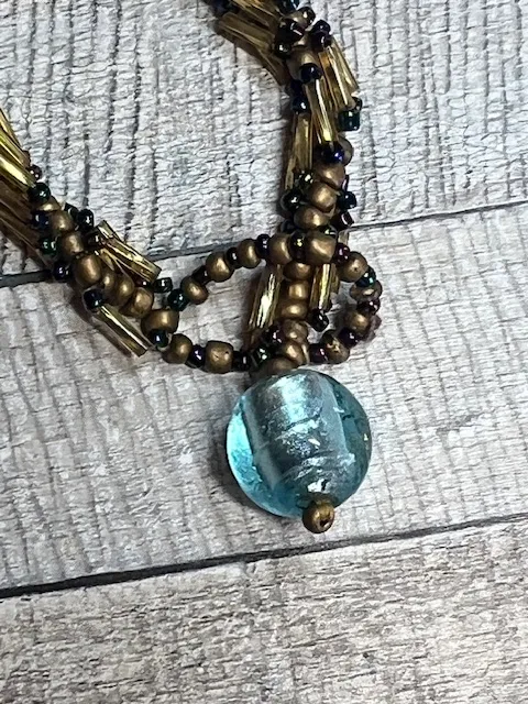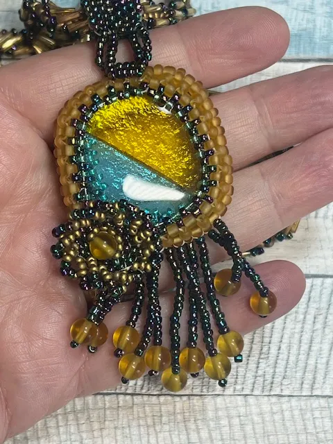 An unusual handmade necklace consisting of a twist of golden glass bugle beads with dark AB rainbow seed beads. The focal piece, which can be removed from the rope for a new look, is handmade fused glass caged with glass beads. The clasp is a glass bead and loop - no metal parts.