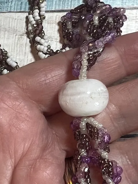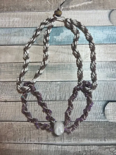 An unusual handmade necklace consisting of two beaded ropes linked together with a hand made lampwork bead as the focal point. The clasp is a glass bead and loop - no metal parts. White, purple and aubergine colours.